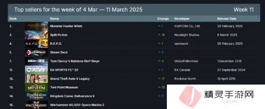 Steam DB日前统计了2025年第11周Steam周销榜的数据,卡普空推出的动作游戏《怪物猎人:荒野》热度不减,实现了三连冠。本期榜单新作相对较少,普遍还是以打折的老游戏为主。