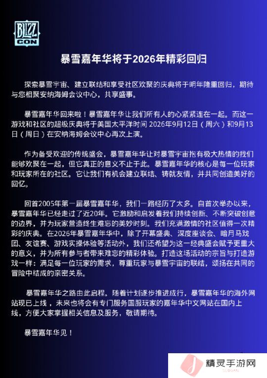 暴雪官方提到:2026年暴雪嘉年华中,除了开幕盛典、深度座谈会、暗月马戏团、友谊赛、游戏实操体验等活动外,我们还希望为这一经典盛会赋予更重大的意义,并为所有参与者带来难忘的精彩体验。