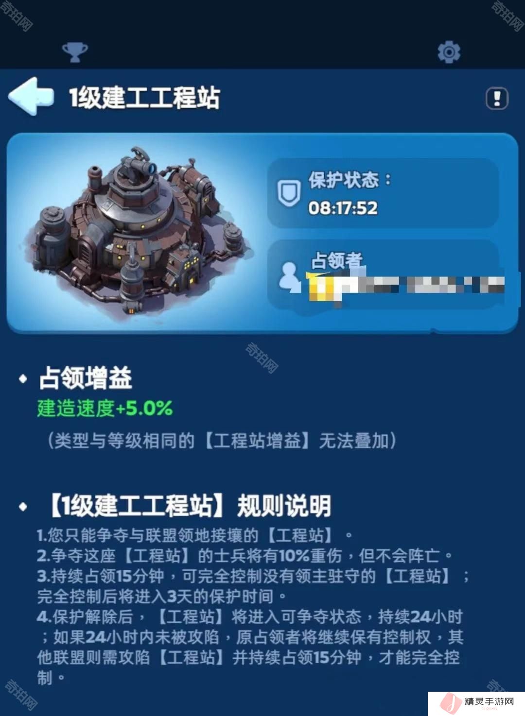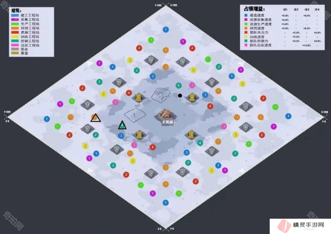 工程站4个等级,8个类型,也就是1个最强联盟需要拿下不同类型不同等级的工程站就是满buff