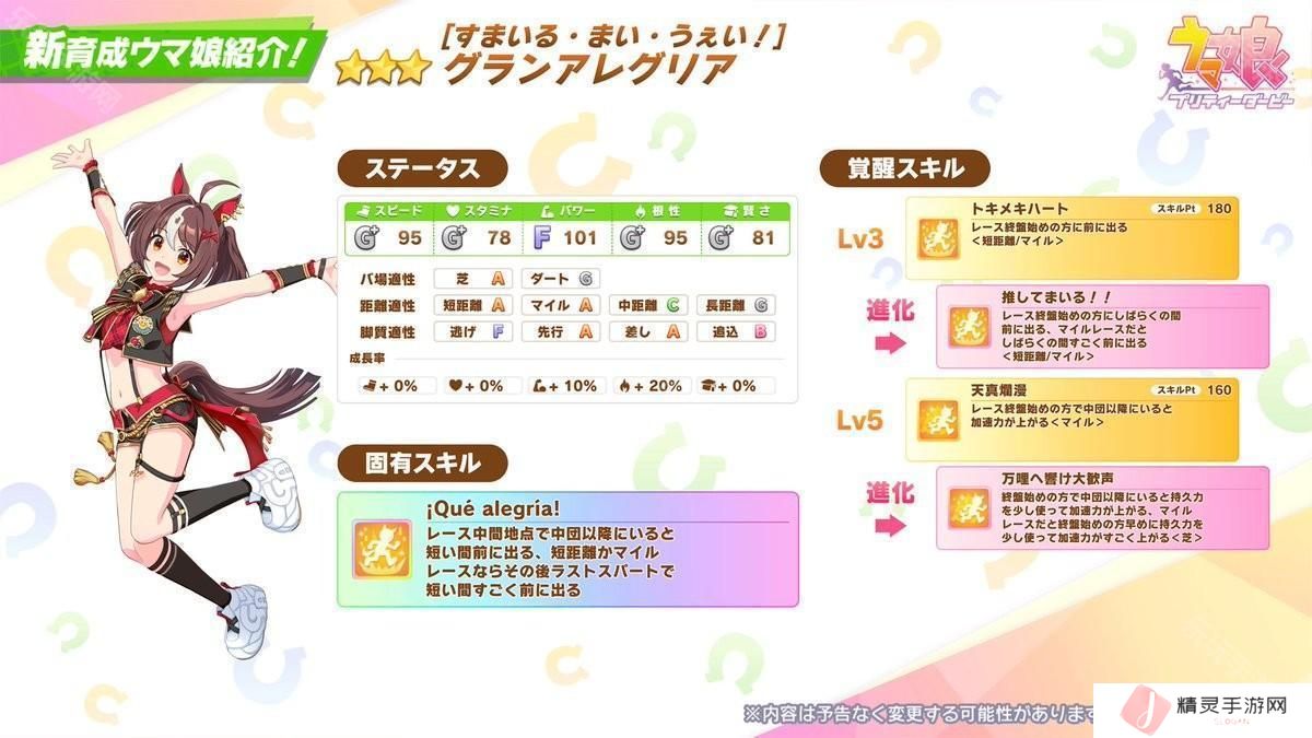 新马娘卡池PU角色为 ★★★ 放声欢呼 [すまいる・まい・うぇい!]グランアレグリア :放声欢呼是有着天真烂漫又超级自信的性格,同时具备惊人运动神经的天才马娘。她的生活方式有着自己独特的尺度,例如每天以从「听收音机议会转播做放松」开始的各种不可思议行为的例行活动。就她本人所说她的生活基准就是「My Rule」。
