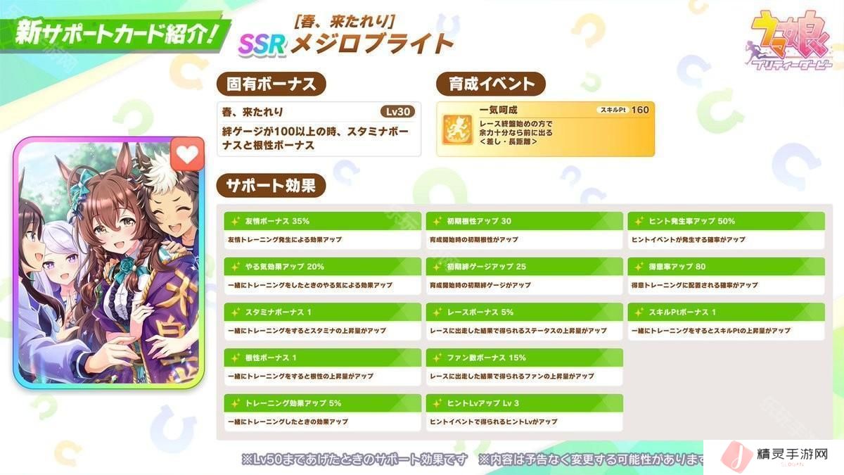新支援卡池PU角色则为 SSR 目白光明 [春、来たれり]メジロブライト 以及 SR 米浴 [しあわせの青いバラ]ライスシャワー 。